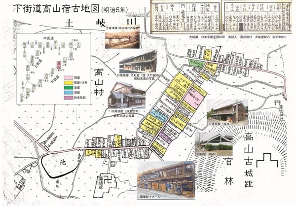 高山は下街道十五里二日の行程の中間地点であったため馬継場、宿場町として栄えた。明治5年の高山村絵図に五人組十九組約百戸、宿屋が十数軒ほど記載されているので、使用人を含めて500人ほどの集落を形成していたものと思われます。