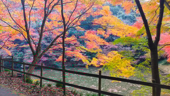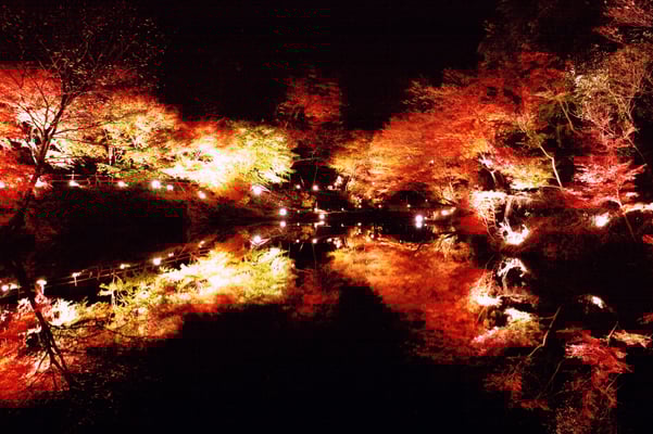 穴弘法は戦国時代の武将を弔うために武田信玄の四代の孫雲峰元冲によって江戸時代に開創された寺の跡地。長い歴史を秘めた由緒ある場所です。地元住民がこの地を整備し地域を盛り上げようと毎年もみじのライトアップを実施しています。大きな池や石仏の周囲には数多くのもみじの古木があり隠れた紅葉スポットとなっています。明るい秋の日差しに照らされる紅葉も綺麗ですが、夜になって水面に映り込む紅葉は息をのむほどの美しさ。石仏群の周辺ではローソクの灯に染まる石仏と竹あかりのかすかな光が幻想的な世界を作り出します。