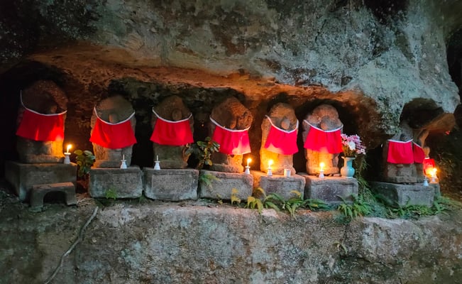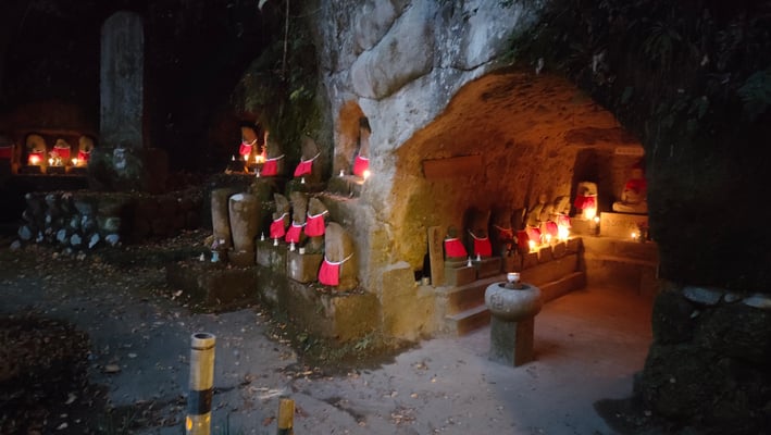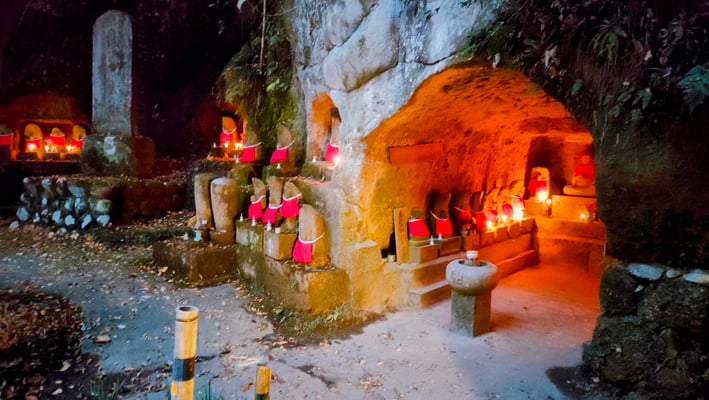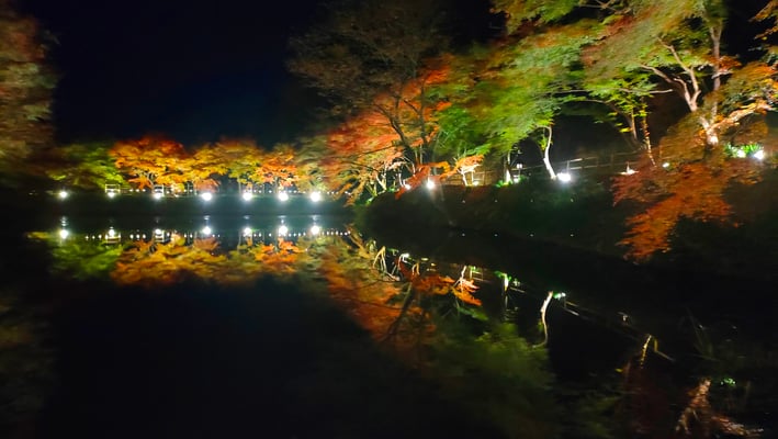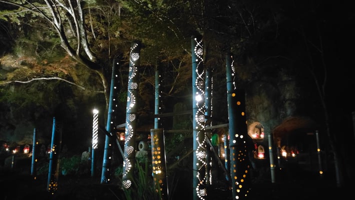 穴弘法は戦国時代の武将を弔うために武田信玄の四代の孫雲峰元冲によって江戸時代に開創された寺の跡地。長い歴史を秘めた由緒ある場所です。地元住民がこの地を整備し地域を盛り上げようと毎年もみじのライトアップを実施しています。大きな池や石仏の周囲には数多くのもみじの古木があり隠れた紅葉スポットとなっています。明るい秋の日差しに照らされる紅葉も綺麗ですが、夜になって水面に映り込む紅葉は息をのむほどの美しさ。石仏群の周辺ではローソクの灯に染まる石仏と竹あかりのかすかな光が幻想的な世界を作り出します。